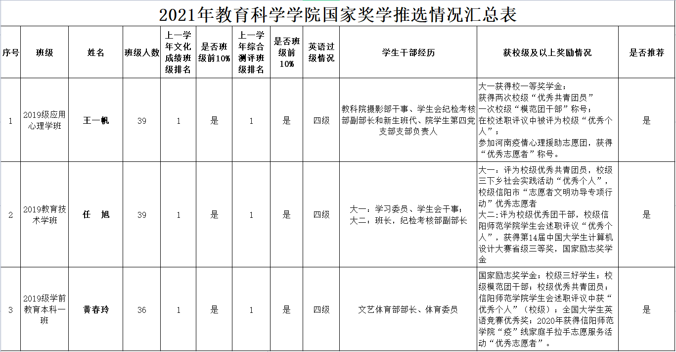 现予以公示。公示期为2021年9月27日至10月1日,节假日不休。如有异议,请在公示期内以实名形式向世界杯网址国家奖学金评定小组反映,联系人:朱方,地址:世界杯网址405室,联系电话:0376—6390135。