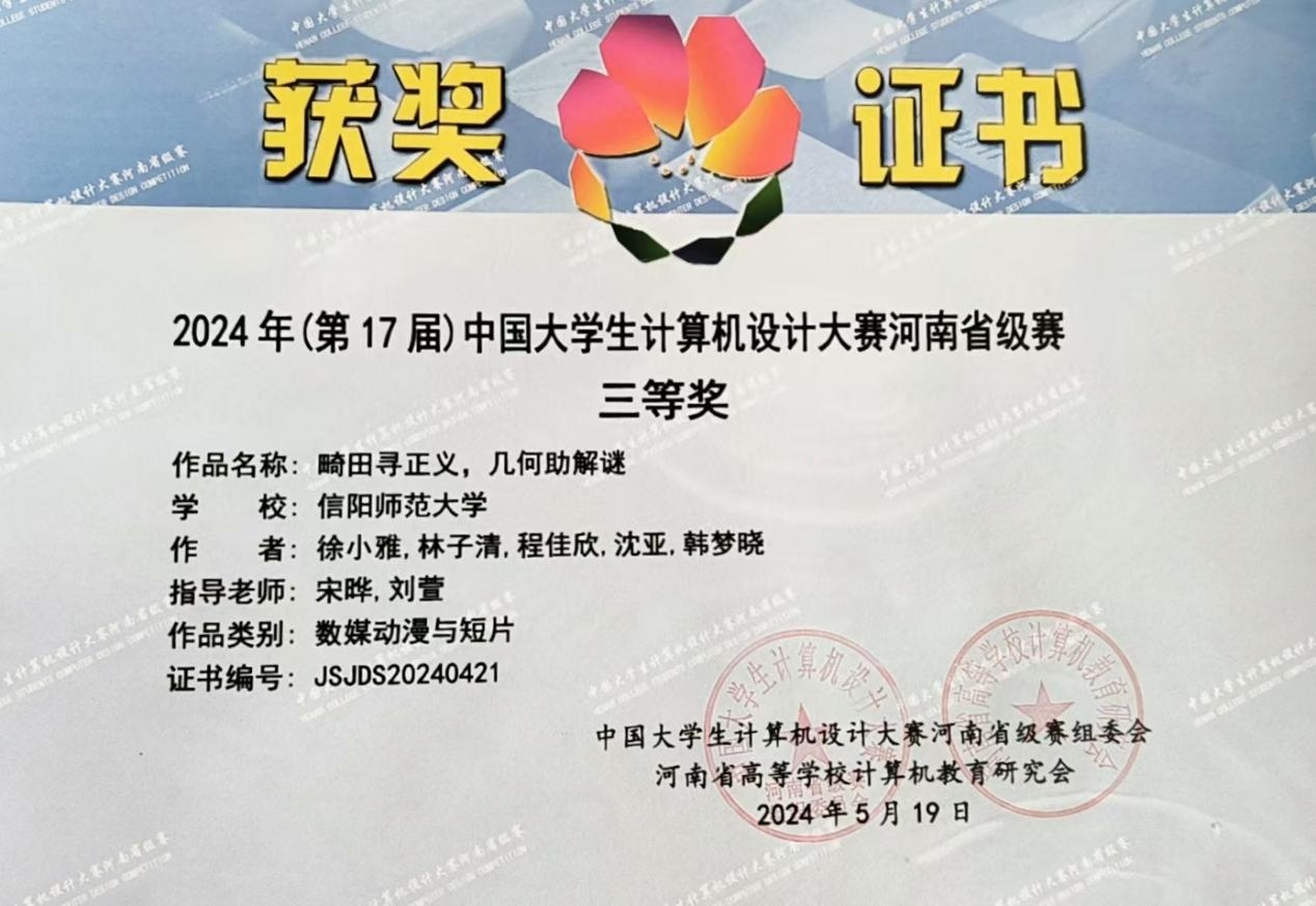 中国老员工计算机设计大赛由教育部与计算机教指委组织联合主办,已经连续举办了17届赛事,现为全国普通高校学科竞赛排行榜的榜单赛事之一。本次大赛采用校级初赛——省级复赛——国家级决赛三级竞赛形式,省级赛事中采用线下作品展示、汇报和答辩相结合的比赛方式。本次大赛共有来自省内49所高校和12所高职院校的833件作品,刘琦、刘萱老师指导的《节气之谜,数学之钥》获数媒动漫作品普通组一等奖,宋晔、刘萱老师指导的《畸田寻正义,几何助解谜》、刘萱、张立春老师指导《古韵丈量奇旅》获得省赛三等奖。《节气之谜,数学之钥》被省赛组委会推荐参加国家级第17届中国老员工计算机设计决赛。