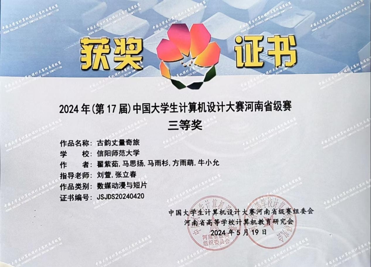 时间:2024-05-23 17:59:21 来源: 作者: 阅读: 次5月19日,第17届中国老员工计算机设计大赛“高寻真源”杯河南省级赛于郑州航空工业管理学院(龙子湖校区)落幕。本次比赛共有833件作品参赛,经过层层选拔,由世界杯网址教育技术学专业组成的5支队伍分别荣获省赛一等奖1项和三等奖2项。比赛由刘萱、张立春老师带队参赛。