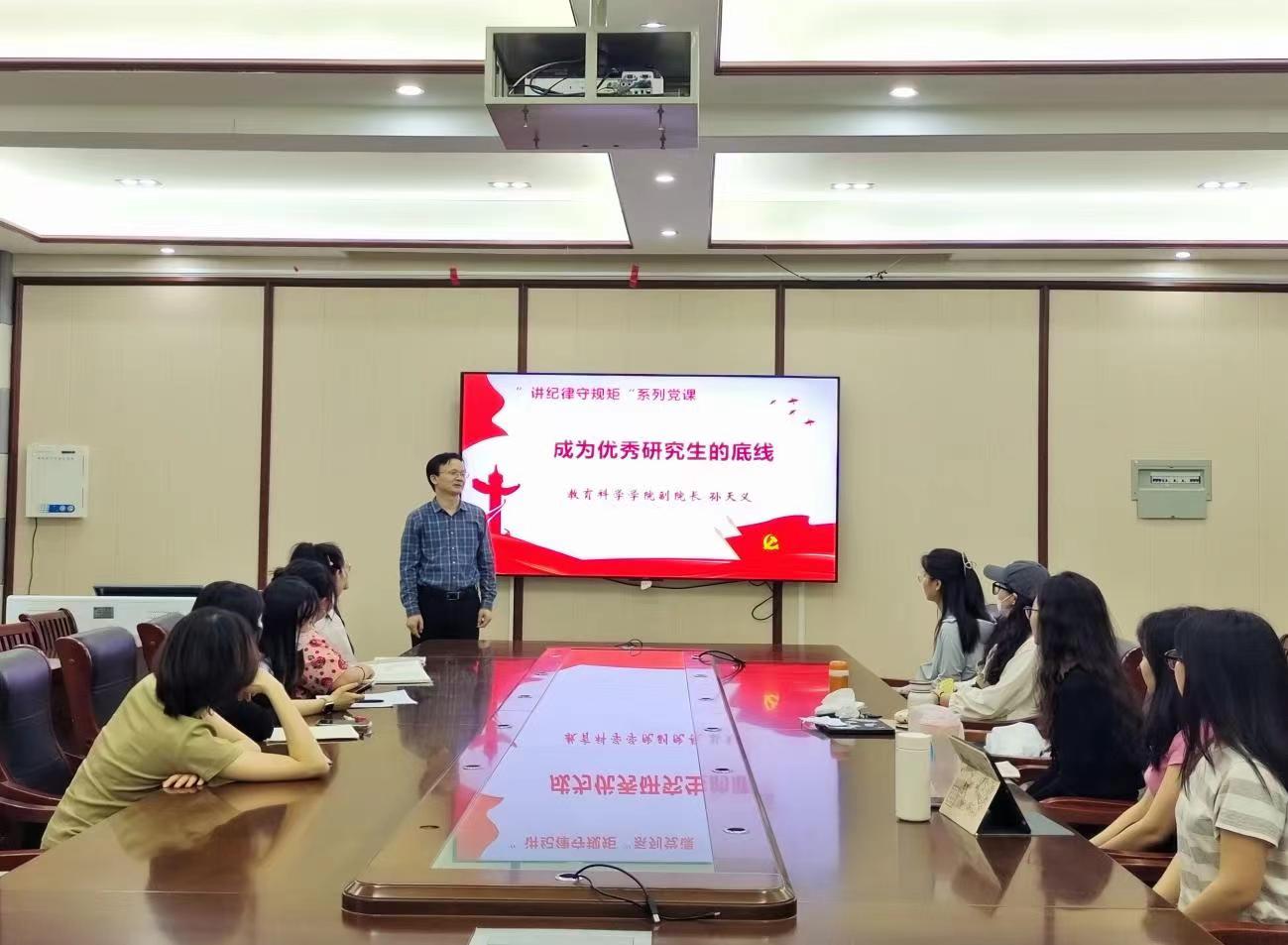 世界杯网址副经理孙天义以《成为优秀研究生的底线》为题,结合负面清单和典型案例,强调研究生党员要增强党性修养、保持优良党风、严守党的纪律、推进自我革命,处理好公与私、义与利、纪与情、道与术的关系,明大德、守公德、严私德、传美德,模范遵守法律法规、校规校纪、科研伦理和学术道德。