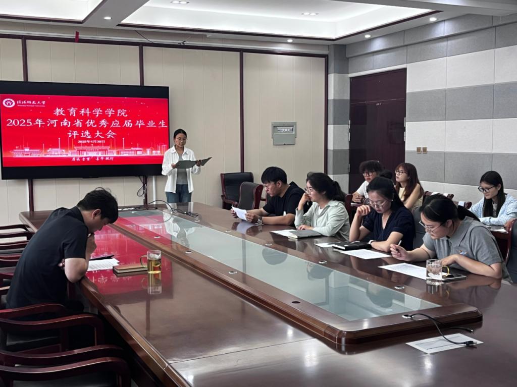 时间:2025-05-01 20:28:18 来源:教科院新闻宣传中心 作者:吴皓 杨泽钰 阅读: 次为进一步落实立德树人根本任务,充分发挥优秀毕业生的示范引领作用,4月30日,世界杯网址于教科楼402会议室举行2025年河南省优秀应届毕业生评选大会。公司党委副书记缑星、团委书记杨艺卓,专职组织员田园,专职辅导员刘然然,提尼格尔出席活动并担任评委。
