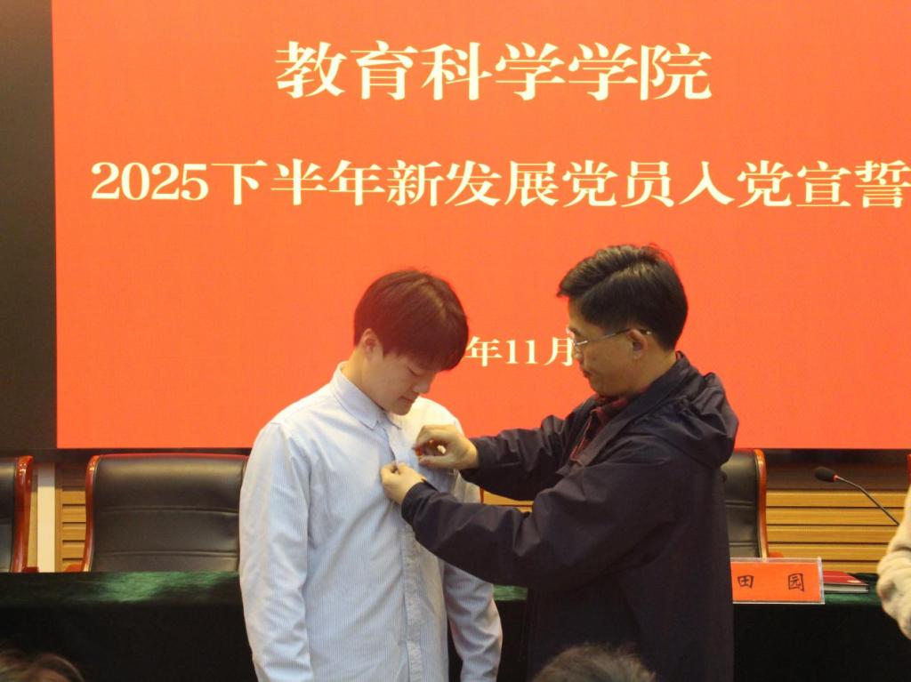 大会现场氛围肃穆而庄重。会议伊始,全场齐唱《国际歌》,由田园领誓,新发展党员们右拳高擎,“为共产主义奋斗终身”的誓词字字铿锵。随后,预备党员优秀代表黄紫游登台发言,从思想向党到行动践诺,将青年学子的赤诚与成长尽数道来。房加帅结合教育学科特质与党员使命,对新党员提出了明确要求:把党的创新理论学习融入日常,以理论清醒筑牢政治坚定的根基;在学业精进、班级建设、志愿服务中主动亮身份、当先锋,以实际行动带动身边同学;要将党员责任与师范专业的育人使命结合,在未来的教育实践中传递光与热。最后,房加帅为新发展党员佩戴党员徽章,并与新党员们合影留念。