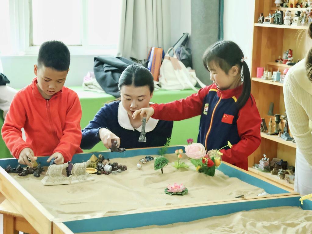 在核心环节团体沙盘游戏中,孩子们自由挑选喜爱的沙具,在沙盘里搭建起独属于自己的场景。老师与志愿者们通过观察沙盘布局与沙具选择,深入分析儿童内心世界,帮助孩子们在非语言的表达中疏解心理压力、平衡心理能量。同时,活动也为家长搭建了读懂孩子需求的桥梁,助力优化亲子沟通,普及儿童心理健康知识。