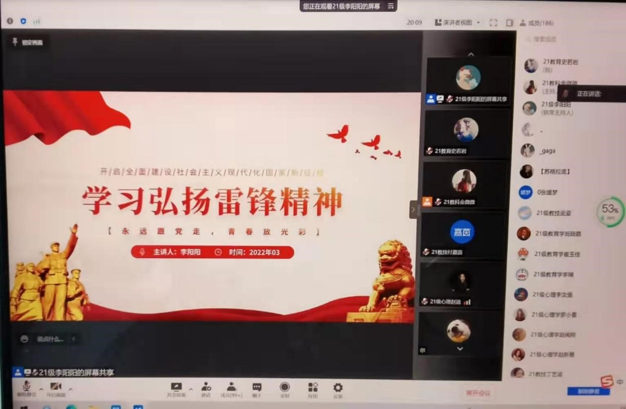 时间:2022-03-30 15:47:39 来源:教科院新闻部 作者:马玉娇 朱亚彤 阅读: 次为贯彻落实习近平总书记关于学习雷锋精神和开展志愿服务工作的重要指示精神,进一步弘扬雷锋精神和志愿服务精神,3月15日至3月25日期间,世界杯网址各班级团支部通过观看主题影片、利用腾讯会议召开主题团课、“学习雷锋精神”专题座谈会等形式陆续开展“学雷锋·树新风”主题团日活动。