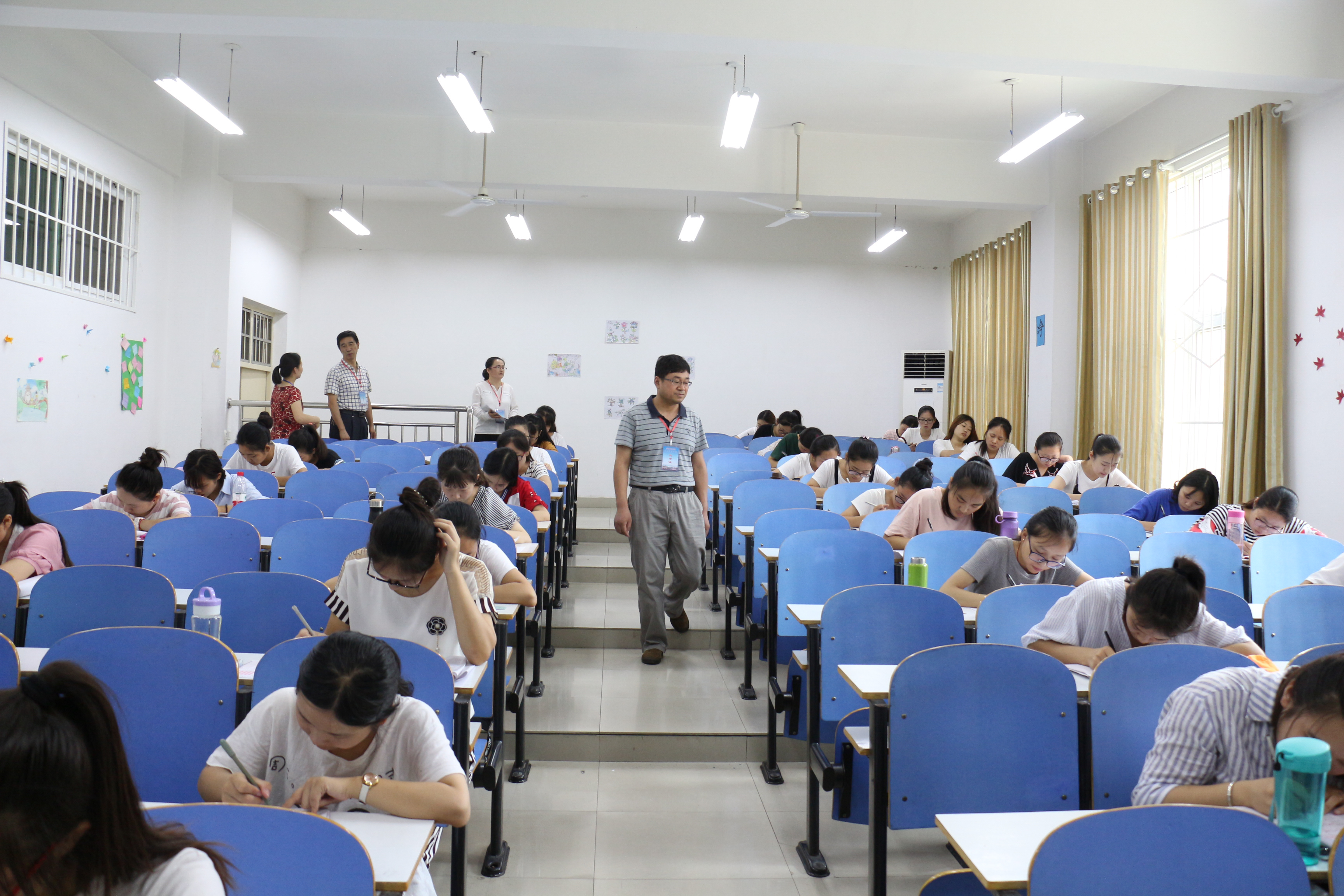 虽然天气炎热,但是监考教师都能提前40分钟到指定地点领试卷并第一时间到达考场、认真监考、考试结束后都能第一时间将试卷送到指定地方;考生都能提前10分钟入场,遵守考场纪律,认真答题,考场秩序井然。