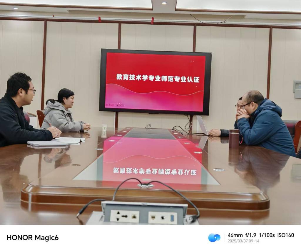 2025年3月7日,教育技术学专业开展师范专业认证交流会,系主任崔宇路、教学秘书刘萱,以及武滨、刘琦老师参加此次会议。
